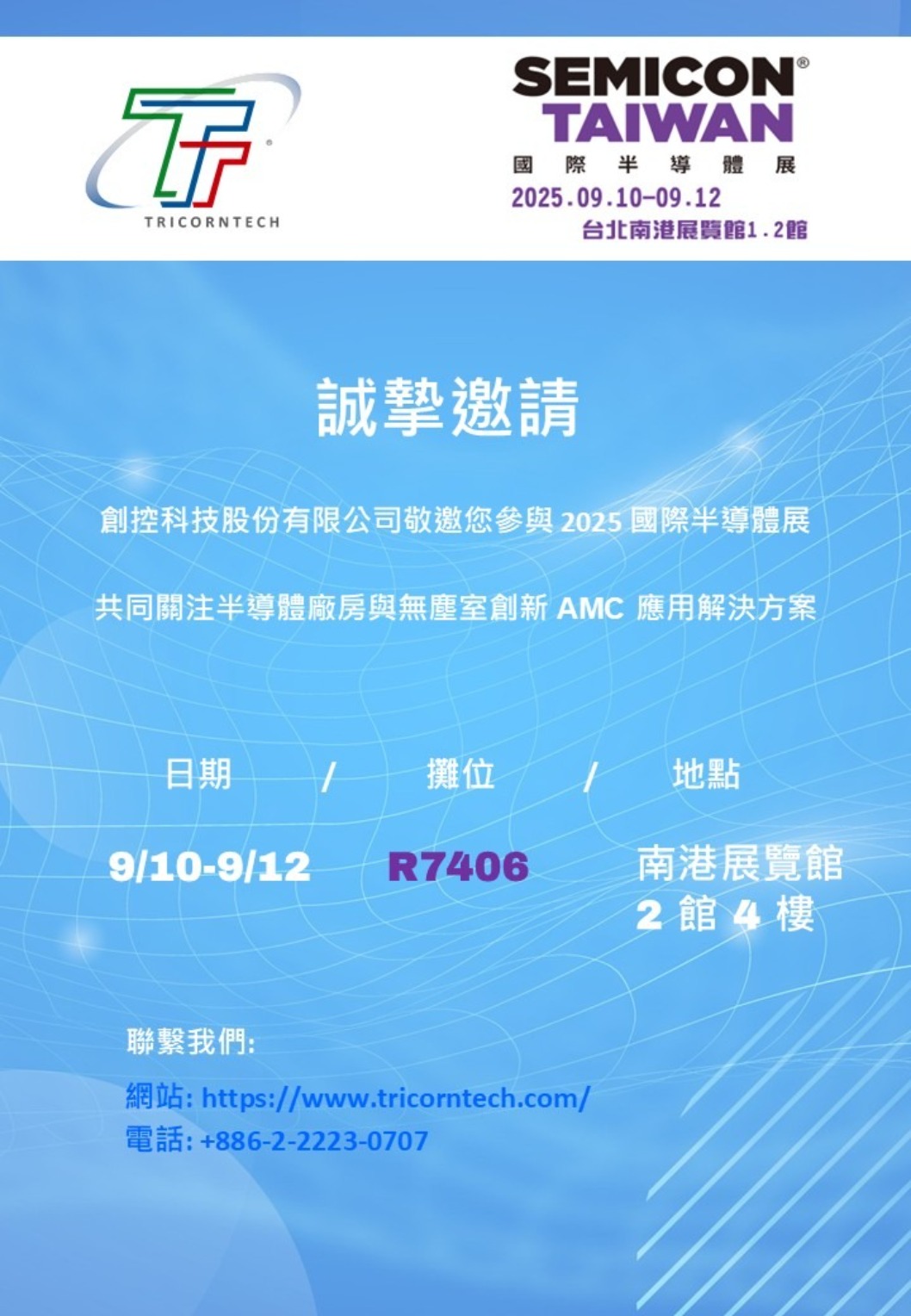?? 歡迎蒞臨 SEMICON Taiwan,體驗創(chuàng)控科技如何幫助半導(dǎo)體廠房打造下一代智慧無污染製造。