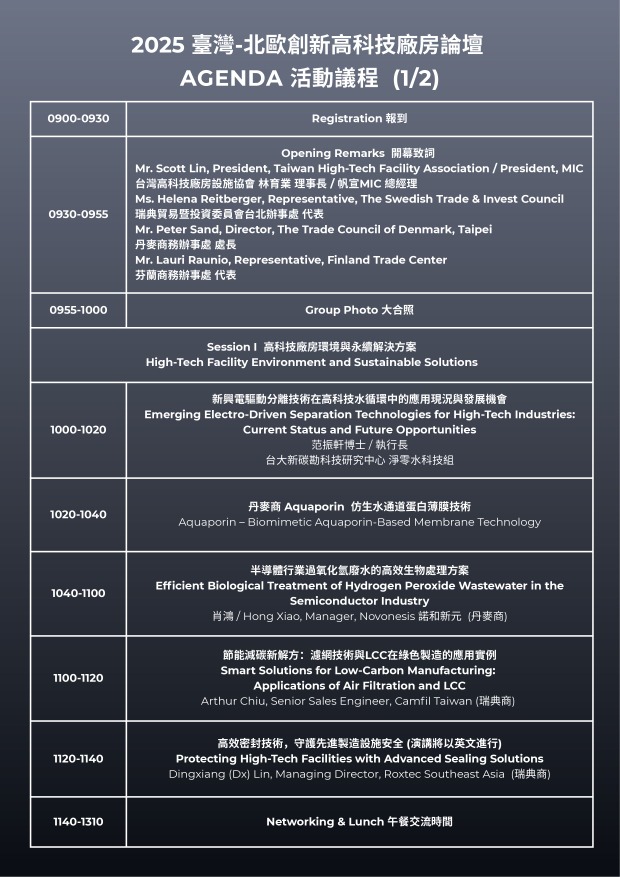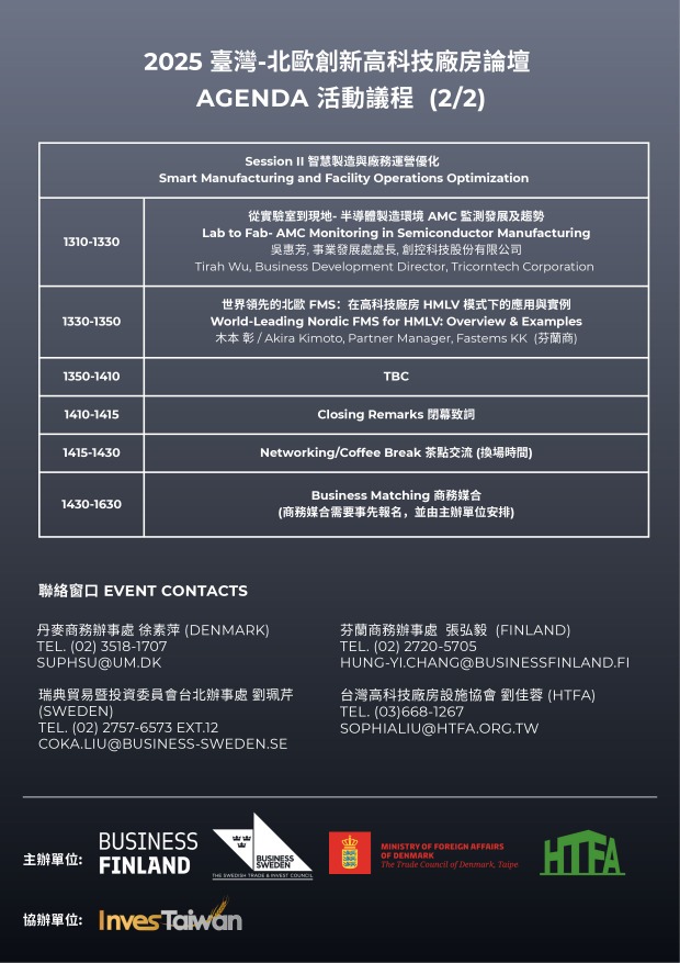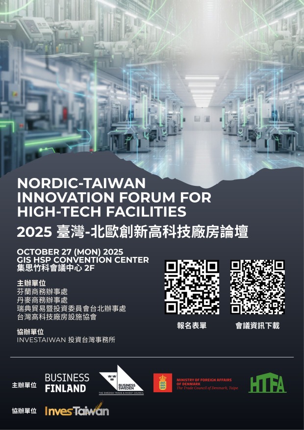 論壇由丹麥、芬蘭、瑞典駐臺辦事處與臺灣高科技廠房設(shè)施協(xié)會 (HTFA) 共同主辦,聚焦智慧與低碳永續(xù)解決方案,邀集北歐與臺灣產(chǎn)業(yè)專家分享經(jīng)驗與成果。